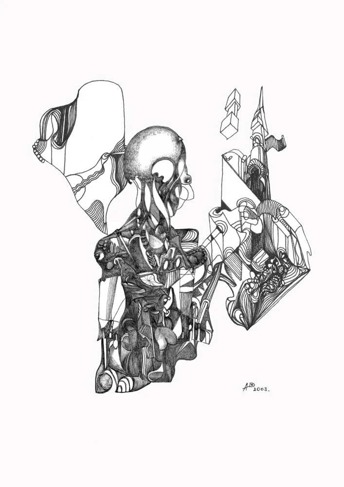 Created in the early 2000s, this drawing is one of several works that marked my return to artistic practice after a long pause. It stands as a response to an oppressive religious environment, whose rigid way of life provoked in me a strong sense of rejection. The interwoven human and mechanical forms express my struggle for inner freedom and the need to remain independent in spirit and thought.